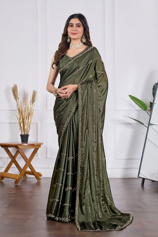 Grace meets glamour in this beautiful Mahendi colour Georgette saree, adorned with premium jarkan border...