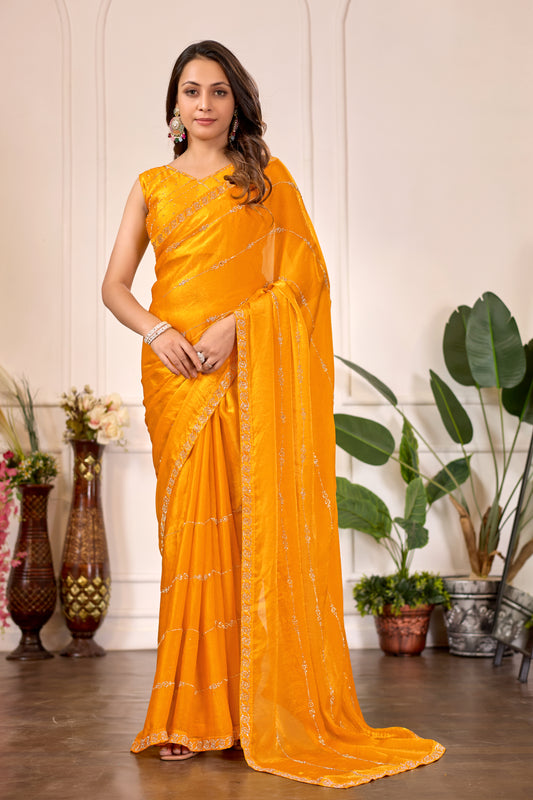 Step into elegance with this stunning Chiffon Saree beautifully embellished with sparkling Jarkan Stone Work....