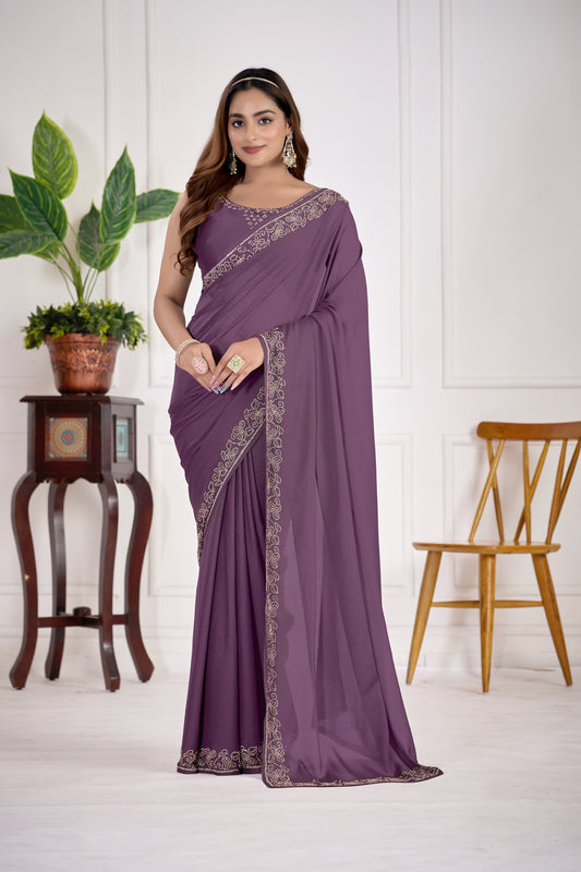 Grace your ethnic look with this elegant Purple Georgette Silk Saree beautifully adorned with sparkling...