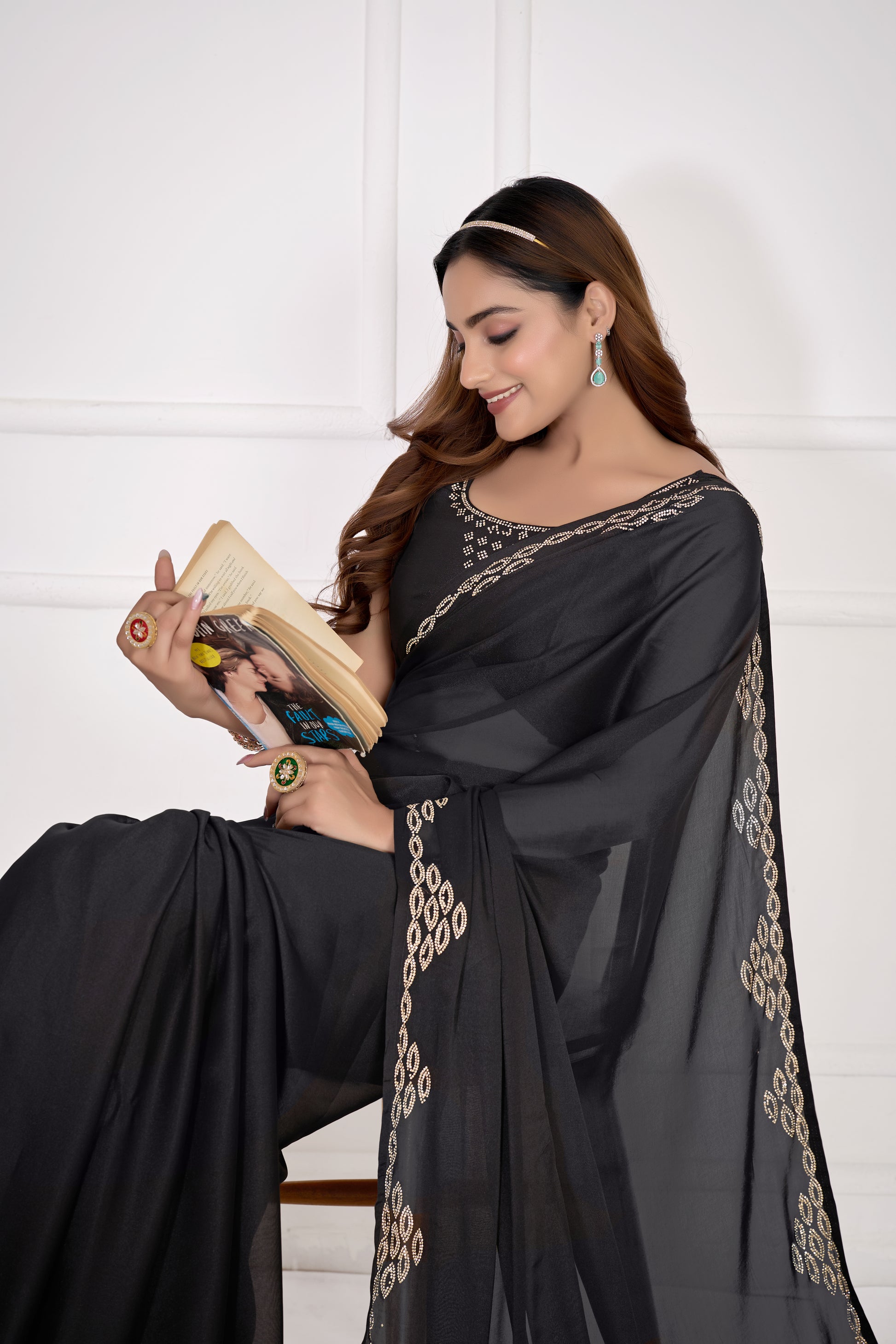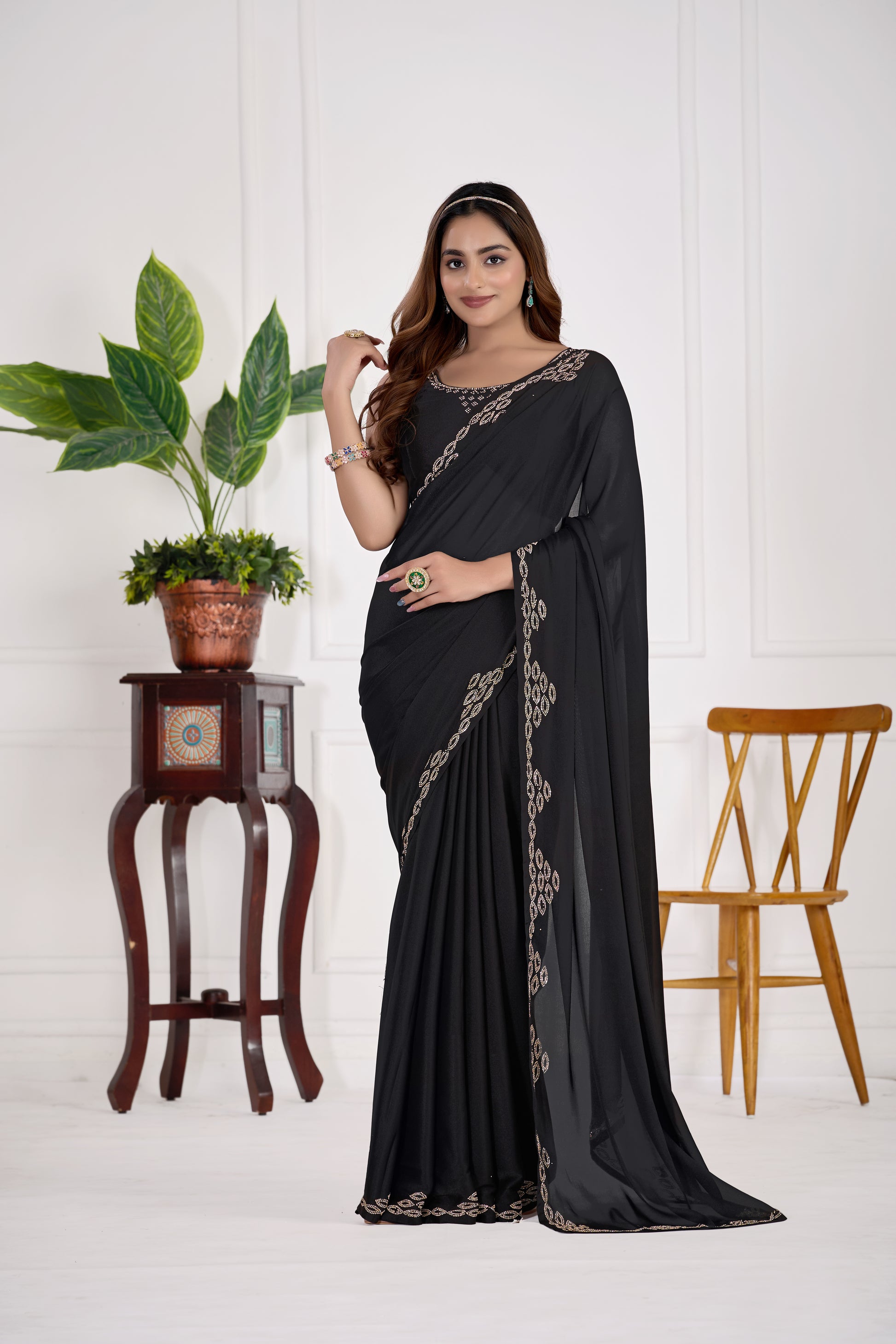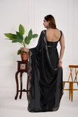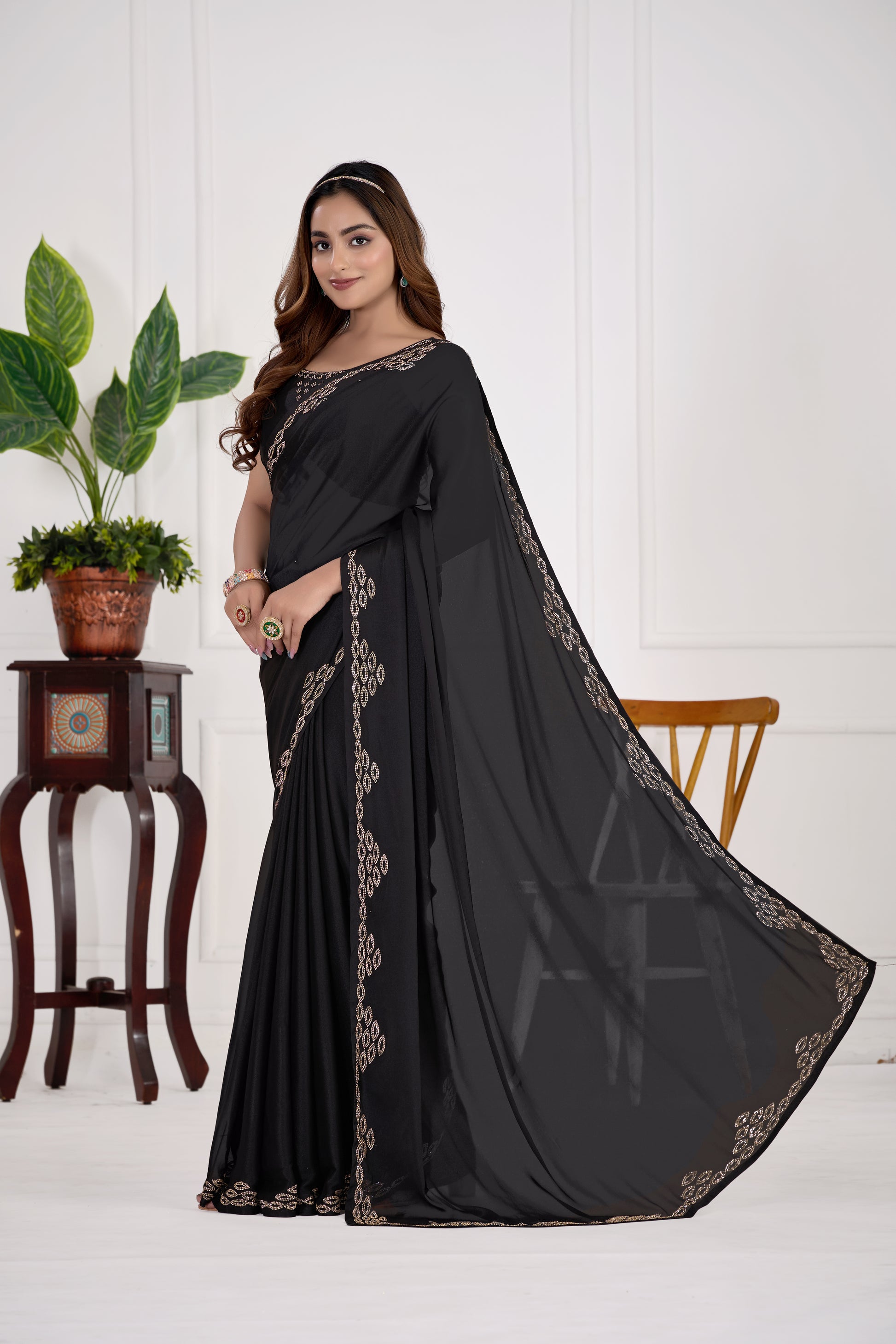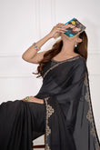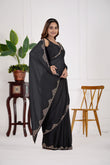 This exquisite black designer saree showcases masterful Jarkan Work on premium Satti silk, making it an indispensable choice for discerning occasions. The intricate StoneWork creates dimensional patterns that radiate understated luxury, while the silk's natural sheen enhances movement and drape. Ideal for weddings, festivals, and formal events, this saree balances traditional artistry with contemporary aesthetics. The rich black base provides versatility in styling, allowing you to pair it with various jewelry and accessories. A sophisticated investment piece that transcends seasonal trends and celebrates refined Indian craftsmanship.