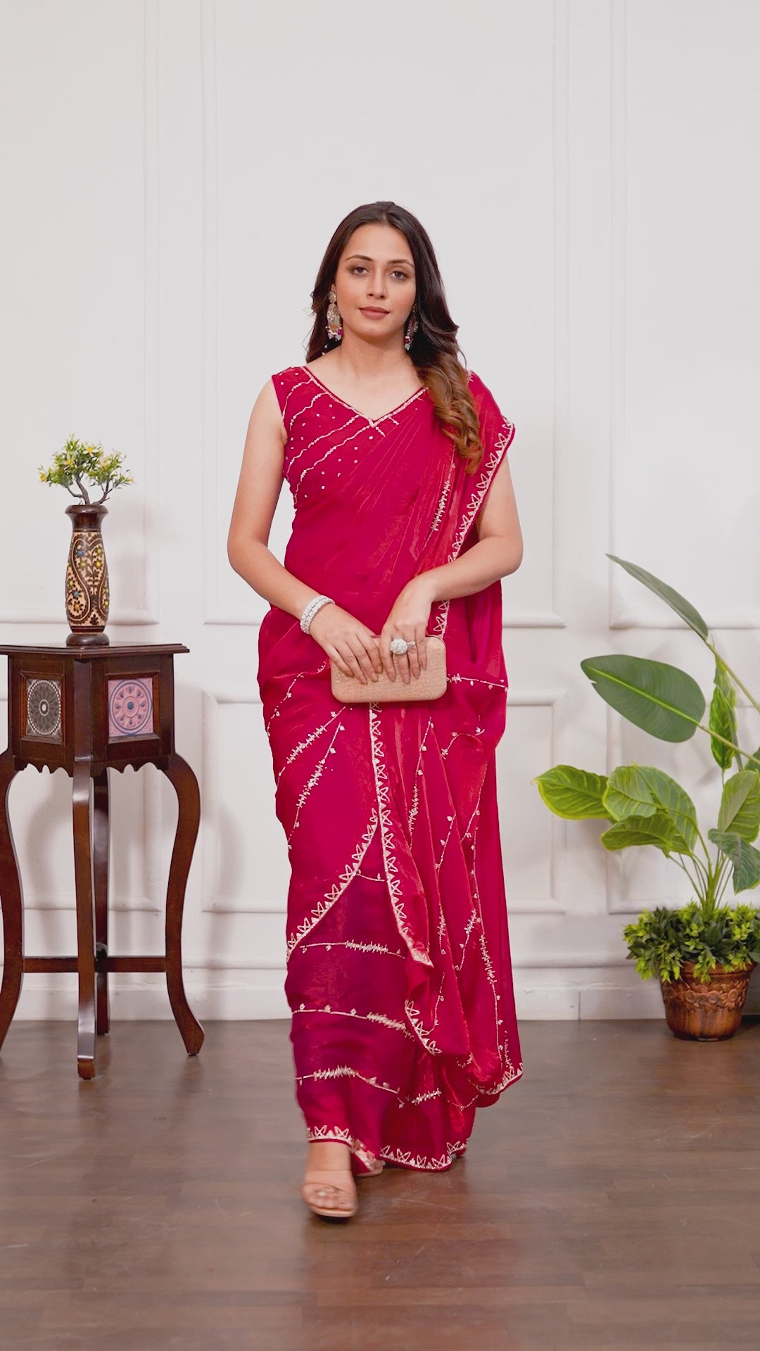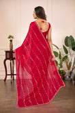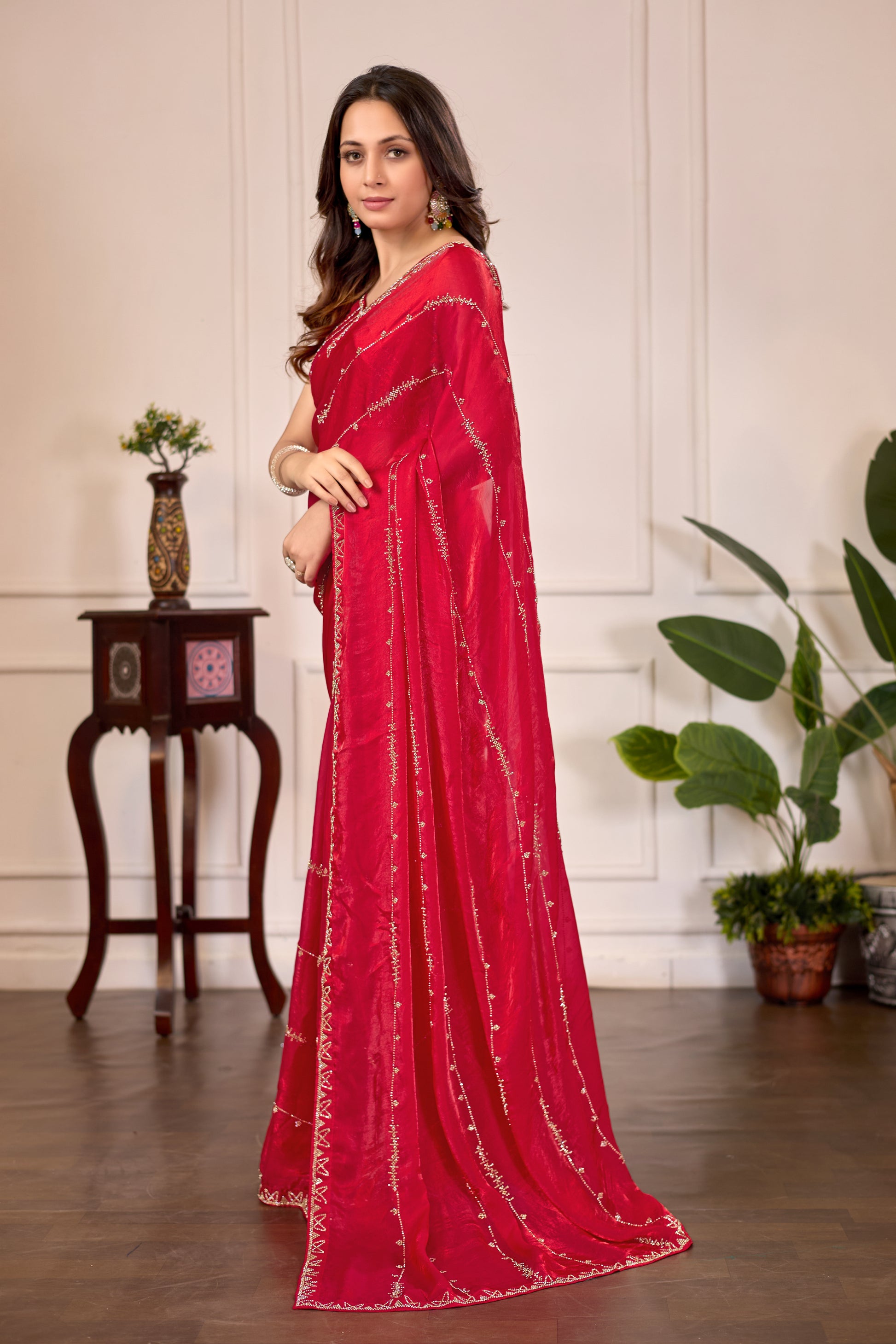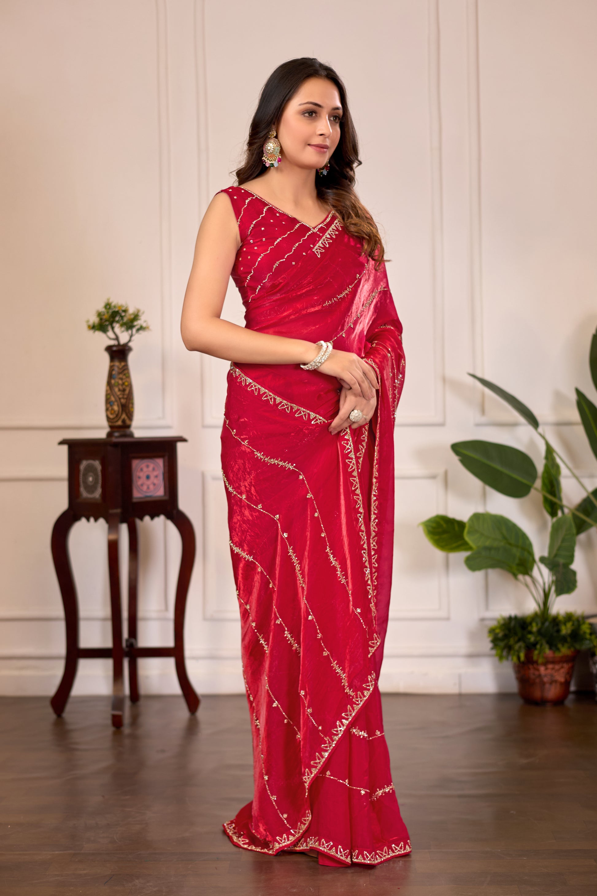 Dark Cherry Rani Satin Silk Saree with Premium Jarkan Lining Work – Party & Wedding Wear