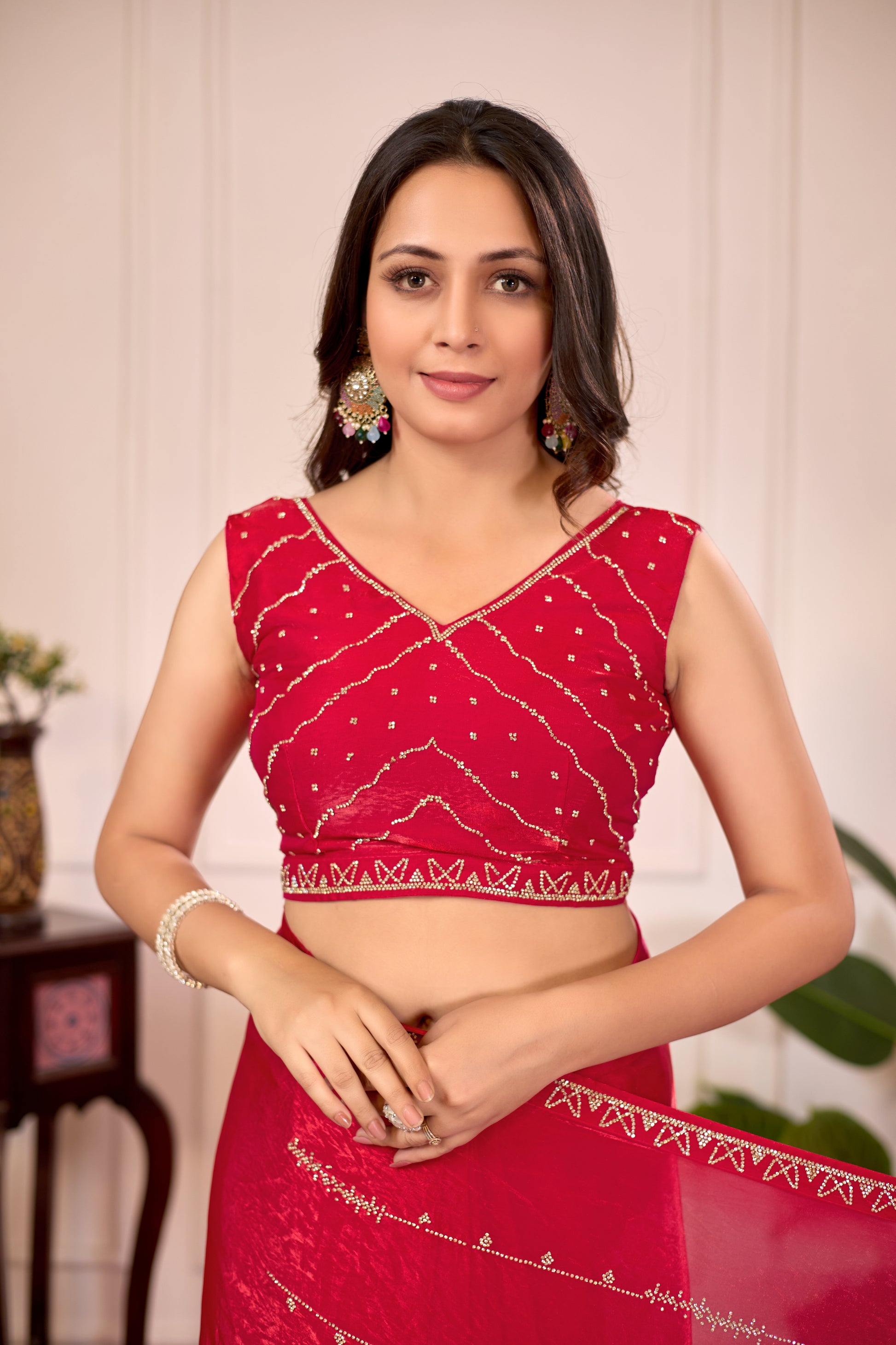 Elevate your festive and party look with this stunning Dark Cherry Rani Satin Silk Saree, beautifully adorned with premium Jarkan lining work that adds a glamorous shine and royal appeal. Crafted from smooth satin silk fabric, this saree drapes gracefully and gives a rich luxurious look, making it perfect for weddings, receptions, parties, and special occasions.
