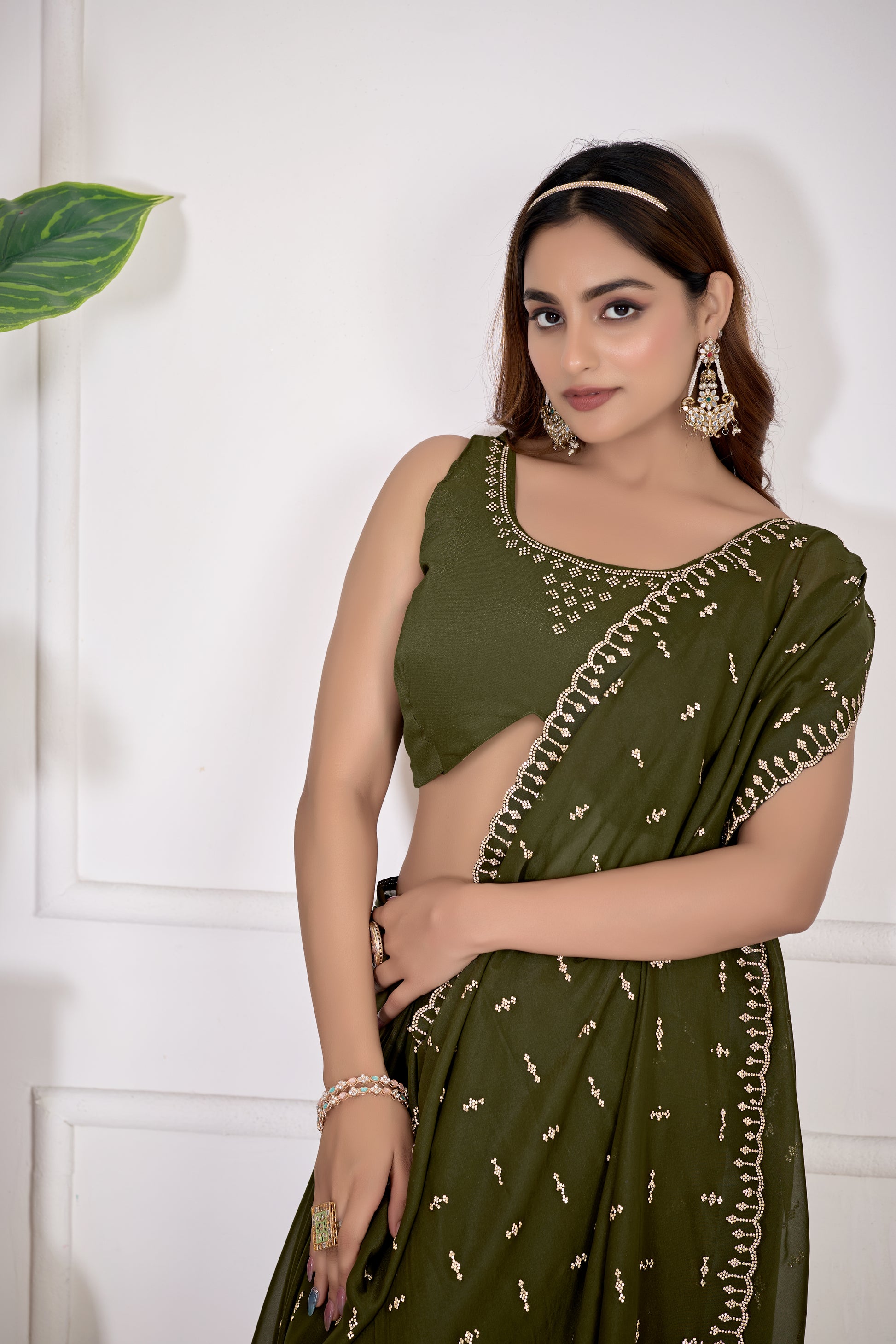 Discover timeless elegance with this Mahendi Green Georgette Saree, a masterpiece designed for discerning patrons of traditional Indian fashion. Crafted from premium georgette fabric, this saree offers exceptional drape and breathability, ensuring comfort throughout your celebrations. The exquisite Jarkan embellishment work showcases meticulous detailing, featuring shimmering accents that enhance the saree's visual appeal without overwhelming its refined aesthetic. The sophisticated mahendi green shade provides a versatile canvas that harmonizes beautifully with various skin tones and jewelry selections. Ideal for weddings, festivals, and formal gatherings, this piece represents the perfect marriage of heritage craftsmanship and contemporary sensibilities. An investment in enduring style that transcends seasonal trends.