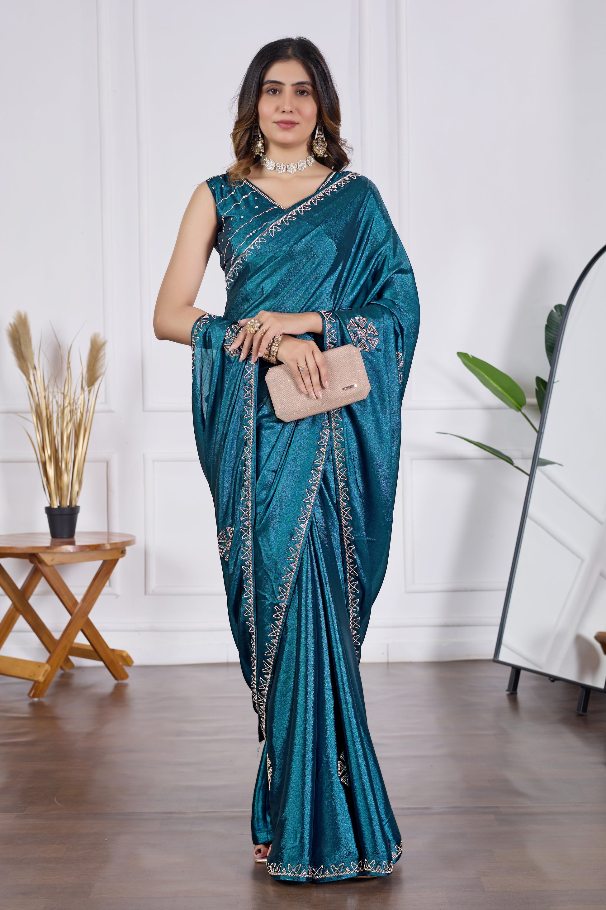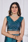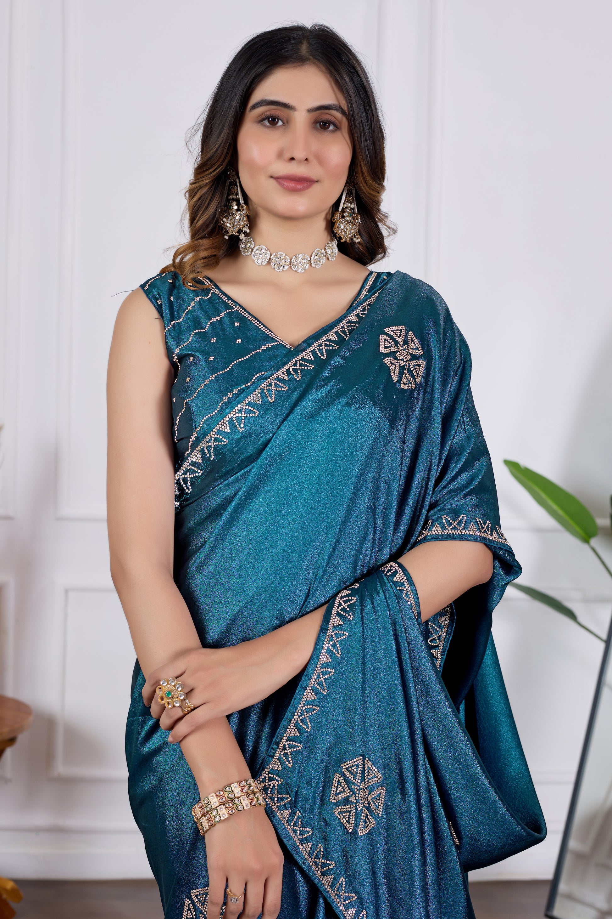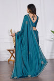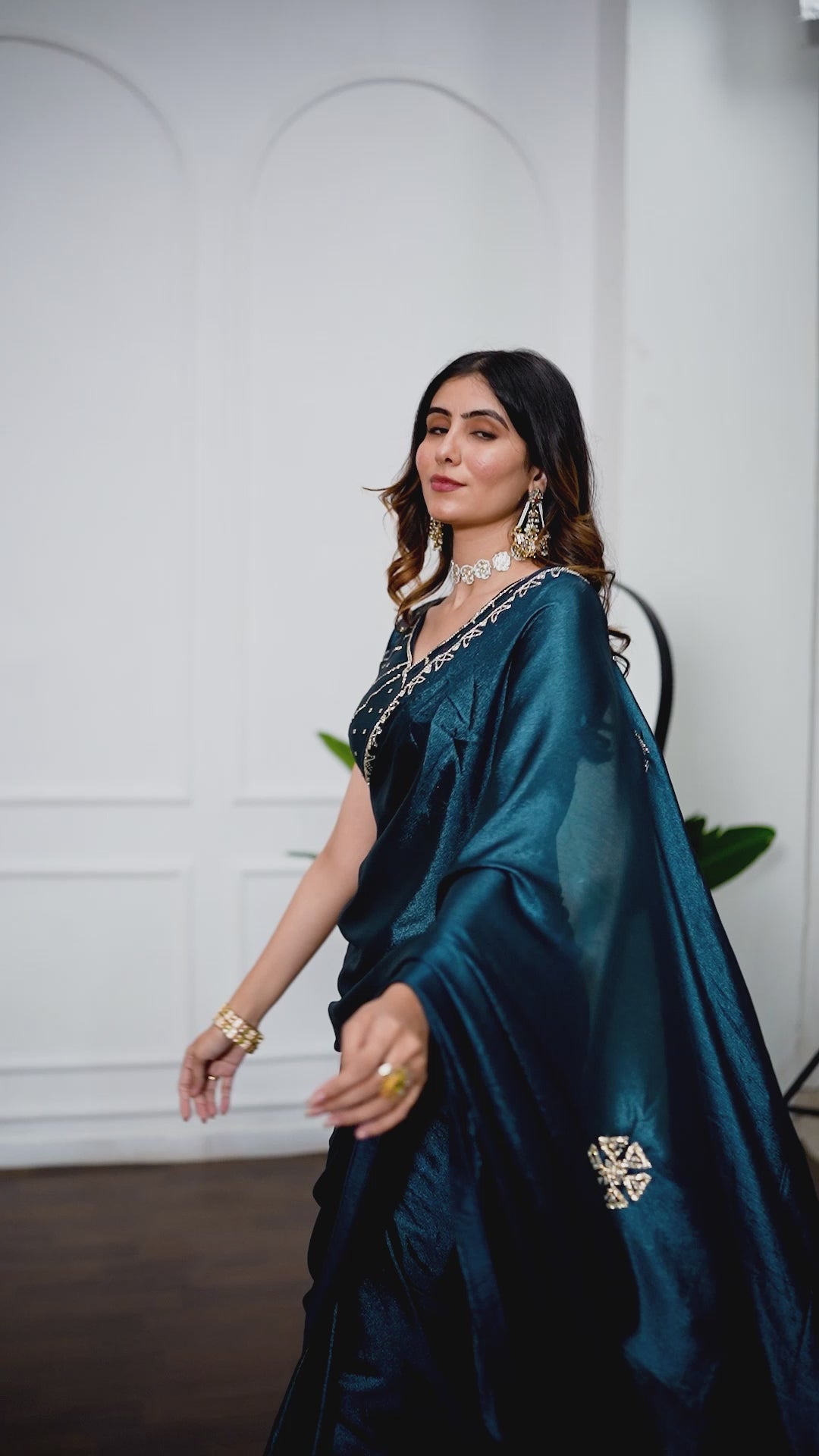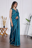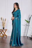Bring a royal charm to your festive wardrobe with this Petrol Blue Jarkan Work Saree, designed to give you a luxurious and stylish look for every special occasion. Crafted in rich, soft shimmering fabric, this saree features beautifully hand-embellished Jarkan stones, elegant border work and designer motifs that add a glamorous shine.