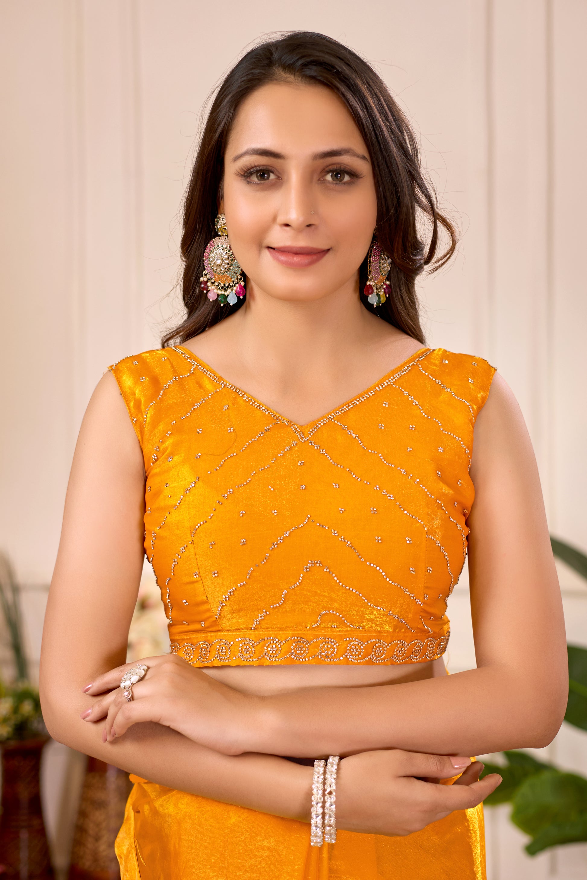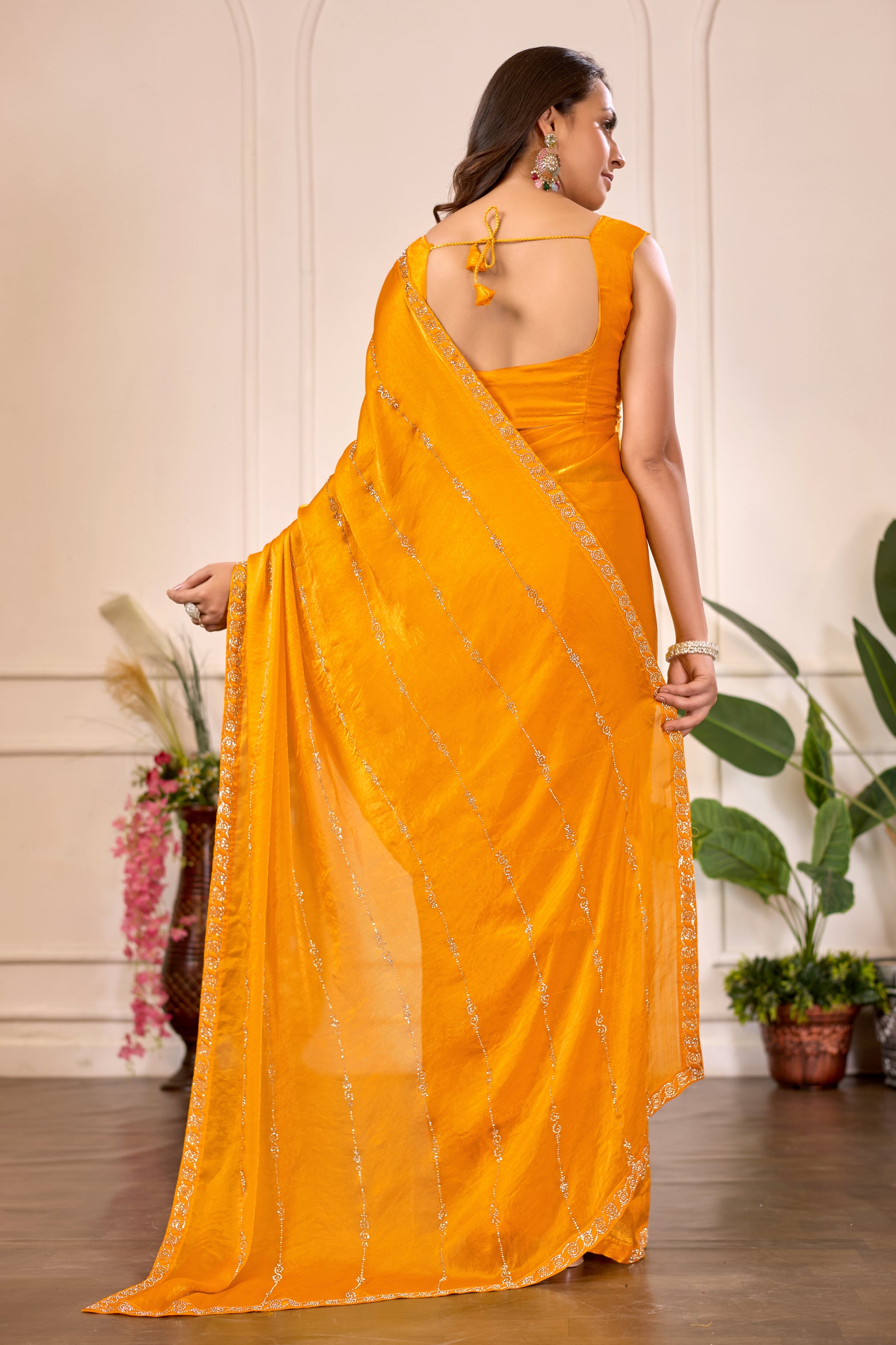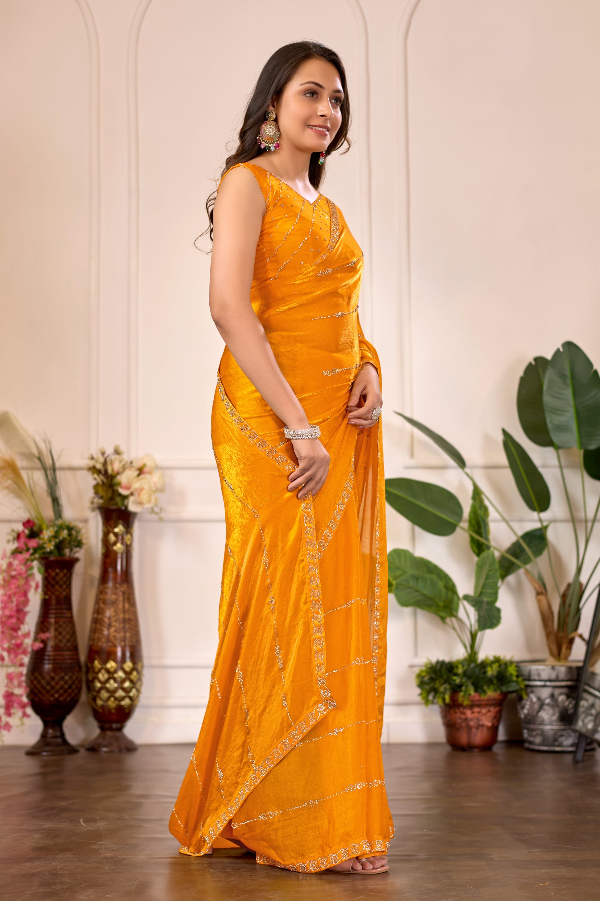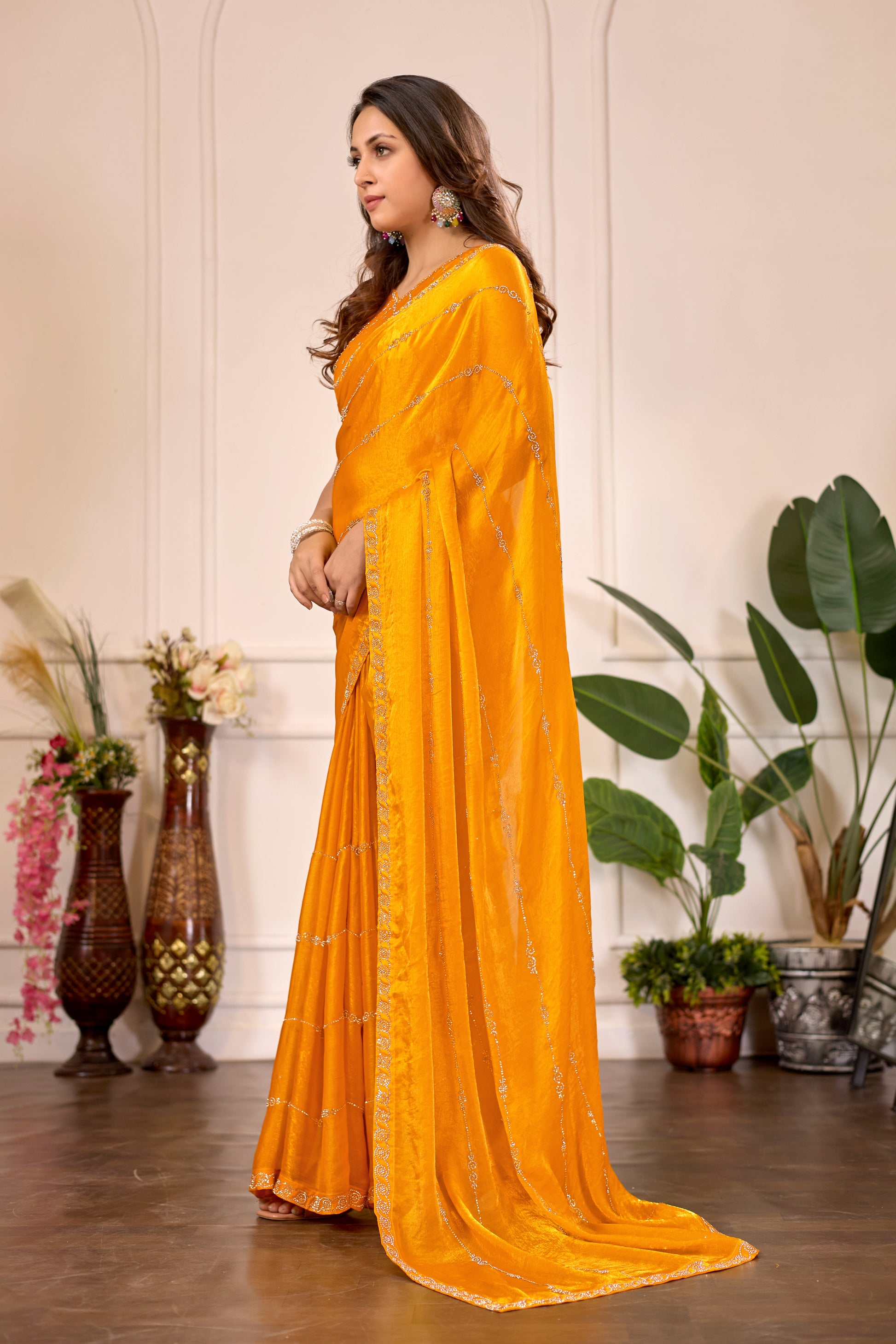 Elevate your festive wardrobe with this stunning mustard yellow saree, meticulously crafted for those who appreciate refined elegance. The saree features intricate stone work that catches light beautifully, adding a sophisticated dimension to your ensemble. The rich mustard hue complements a variety of skin tones while maintaining a timeless appeal perfect for weddings, celebrations, and special occasions. Crafted with attention to detail, this piece seamlessly transitions from traditional gatherings to contemporary festivities. Pair it with classic jewelry and traditional footwear to complete your look. An investment in quality that promises to become a cherished part of your ethnic collection.