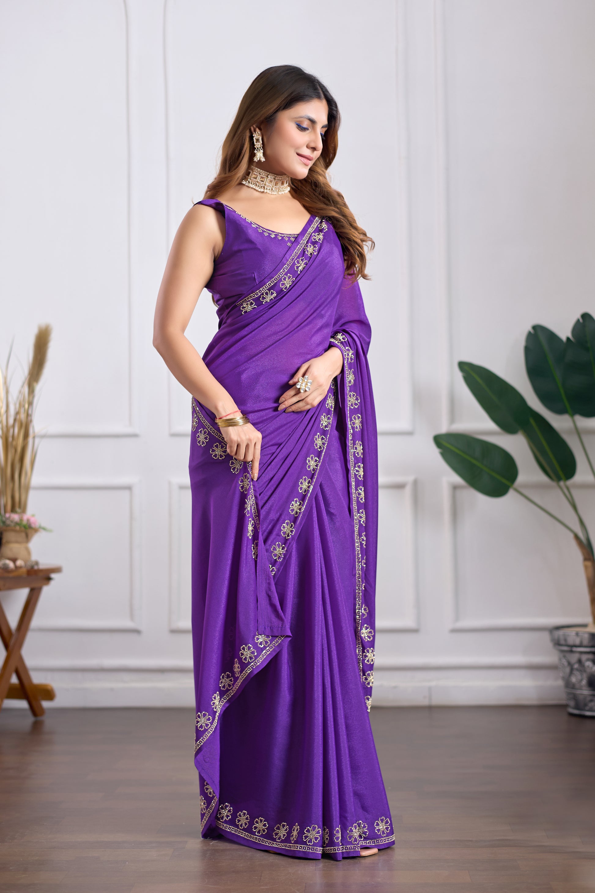 Enhance your ethnic wardrobe with this elegant Purple Georgette Saree beautifully designed with delicate Jarkan Work. Made from soft and lightweight georgette fabric, it drapes gracefully and offers a comfortable fit for long wear. The stylish floral border adds a premium festive touch, making it a perfect choice for weddings, parties, receptions and special celebrations. Pair it with statement jewellery and heels for a complete glamorous look.