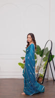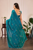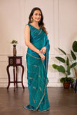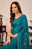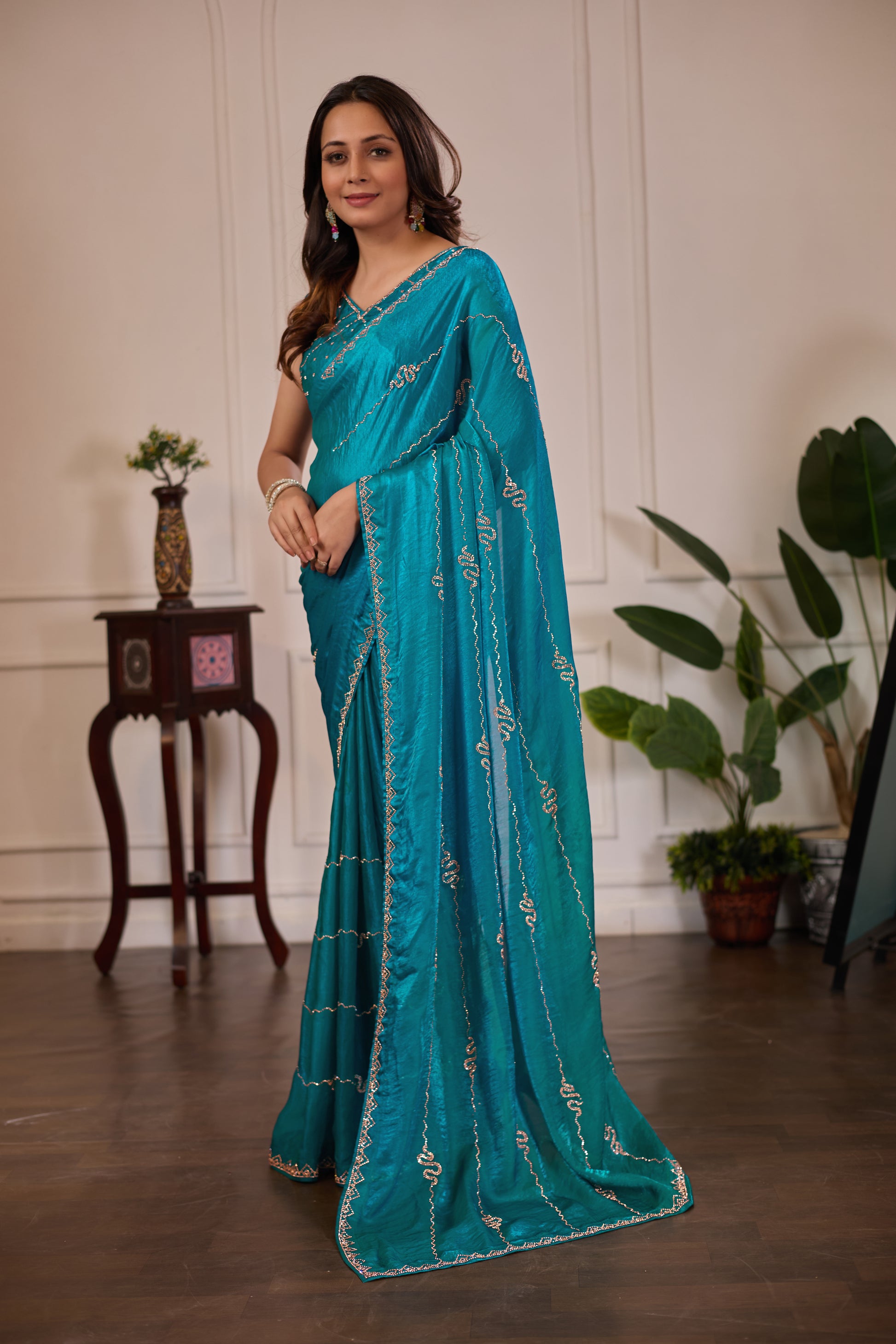 Rama Blue Satin Silk Saree with Designer Lining Pattern & Premium Jarkan Work – Party & Wedding Wear