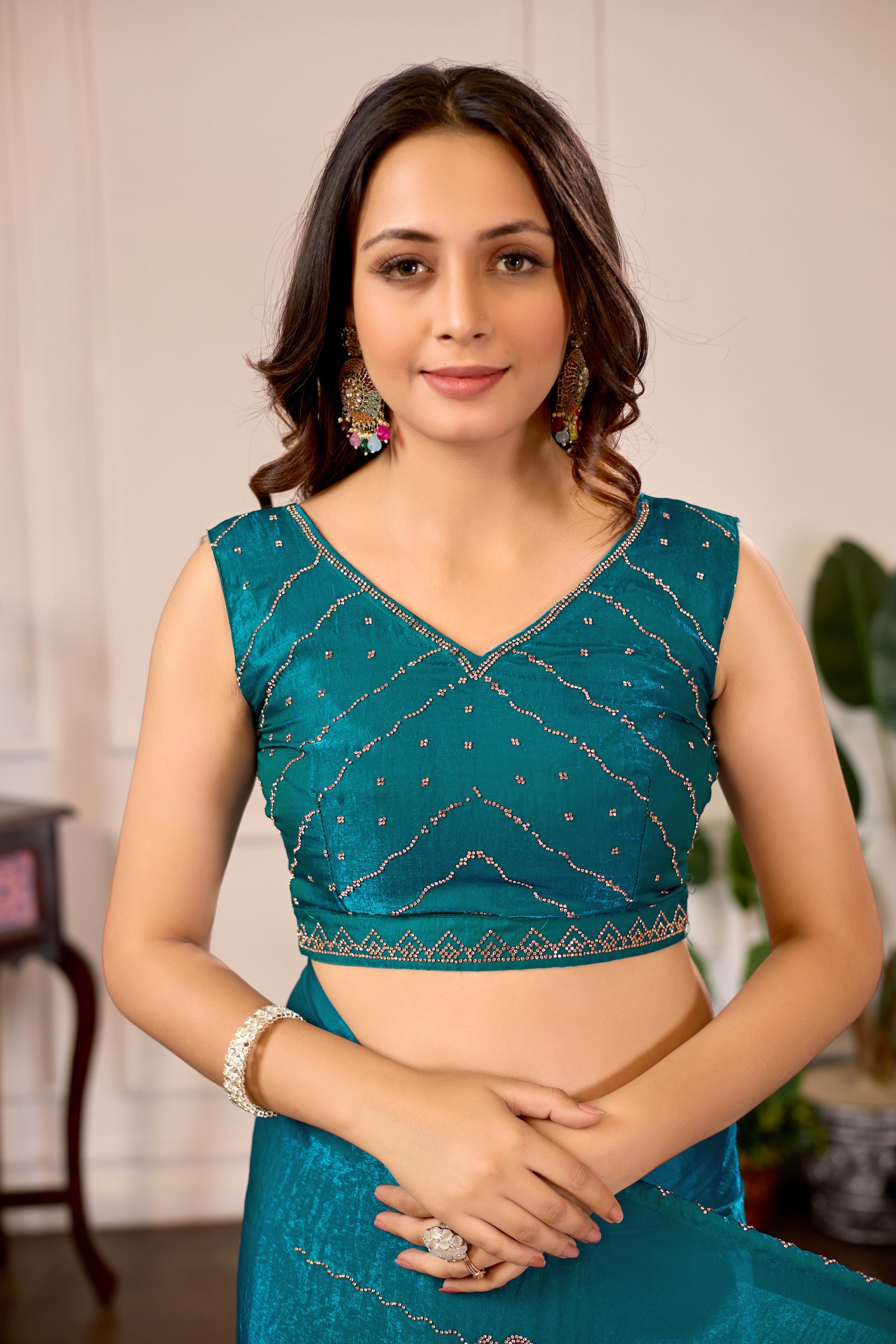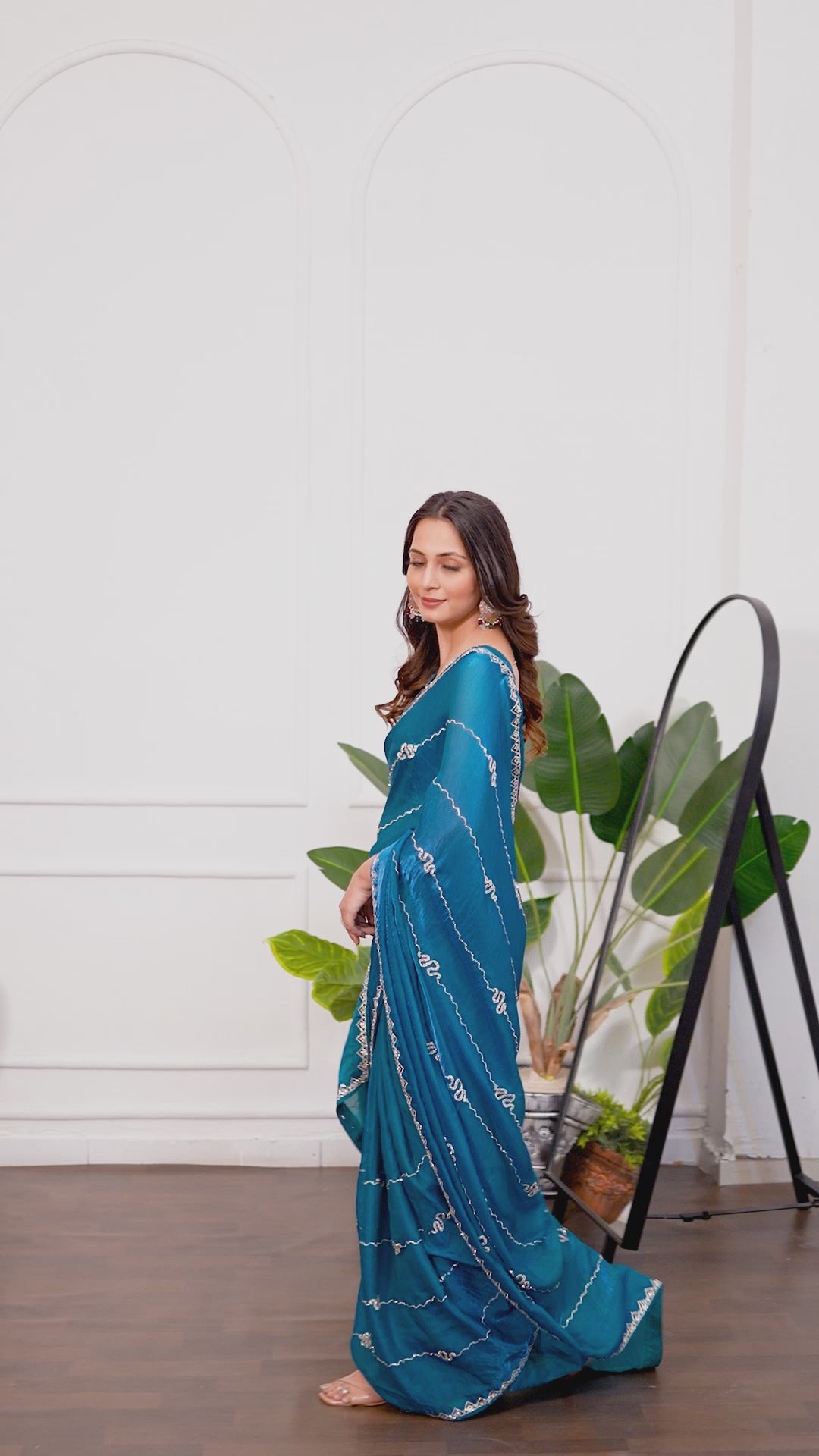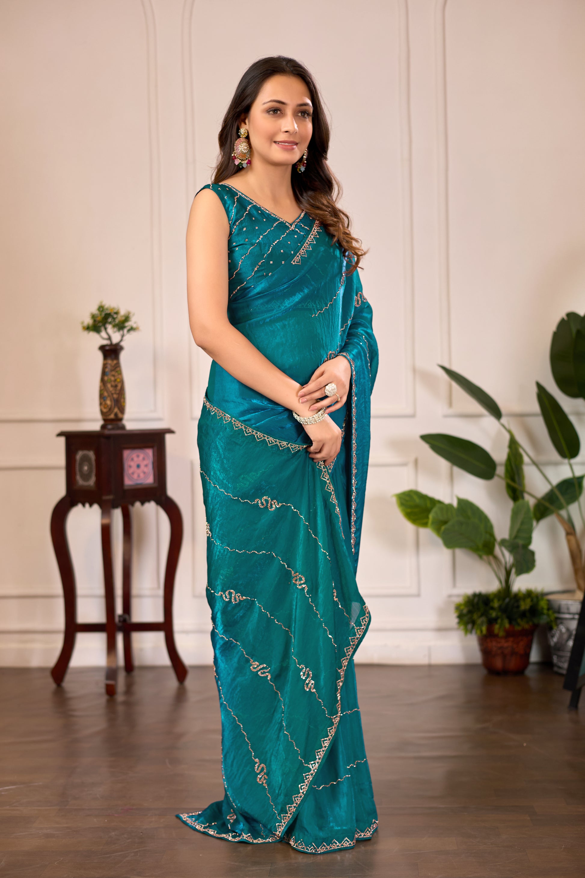 Enhance your ethnic wardrobe with this stunning Rama Blue Satin Silk Saree, beautifully crafted with elegant lining design and premium Jarkan work. The rich satin silk fabric gives a luxurious shine and smooth drape, making it the perfect choice for weddings, parties, receptions and festive occasions.