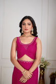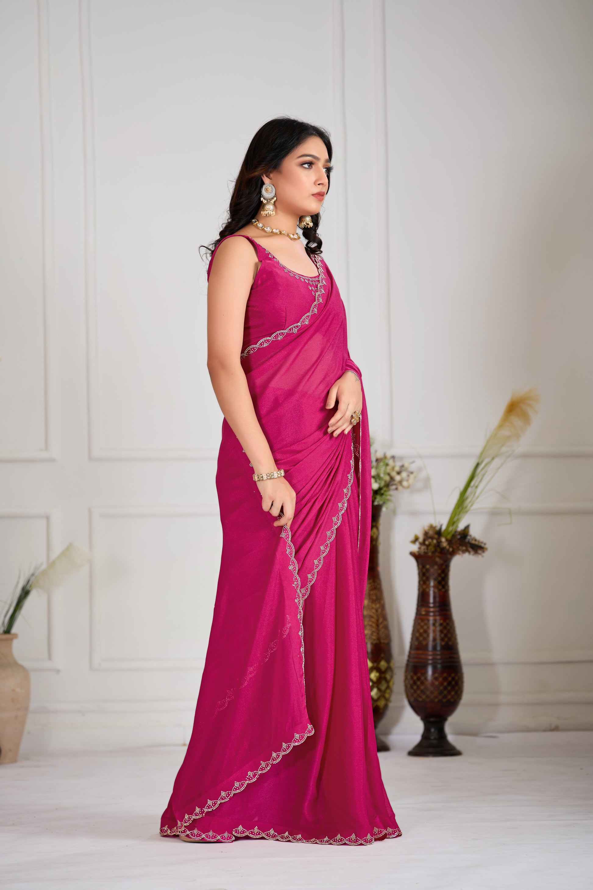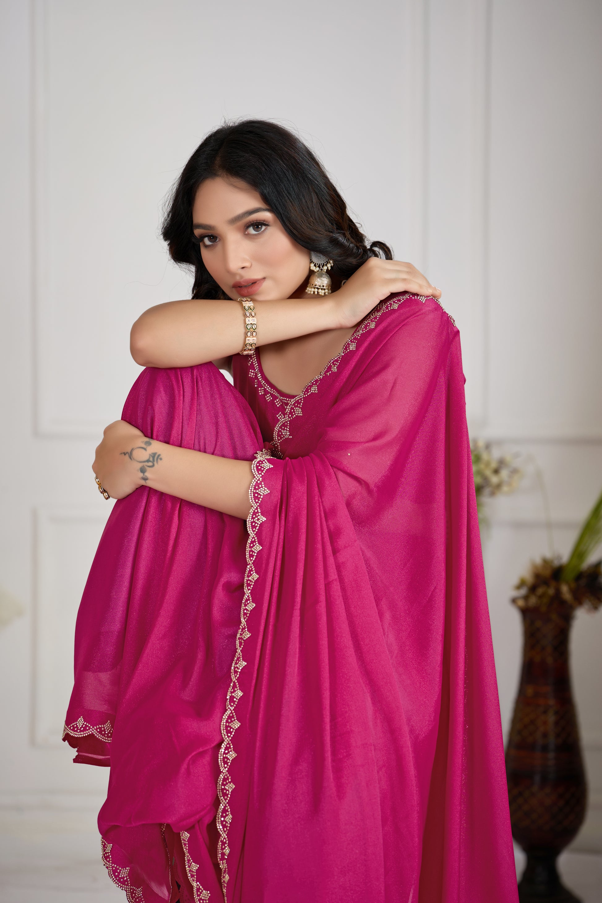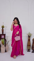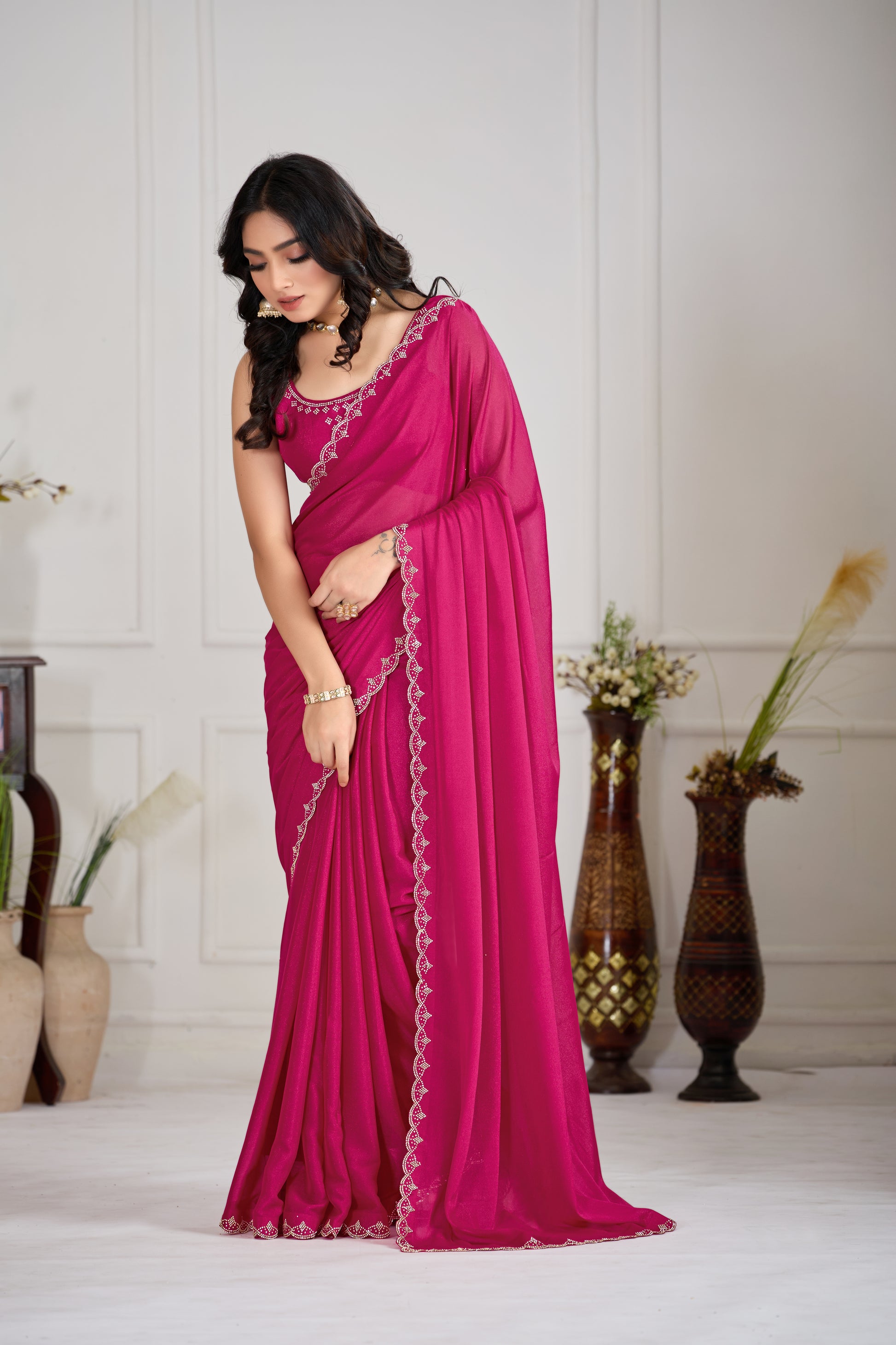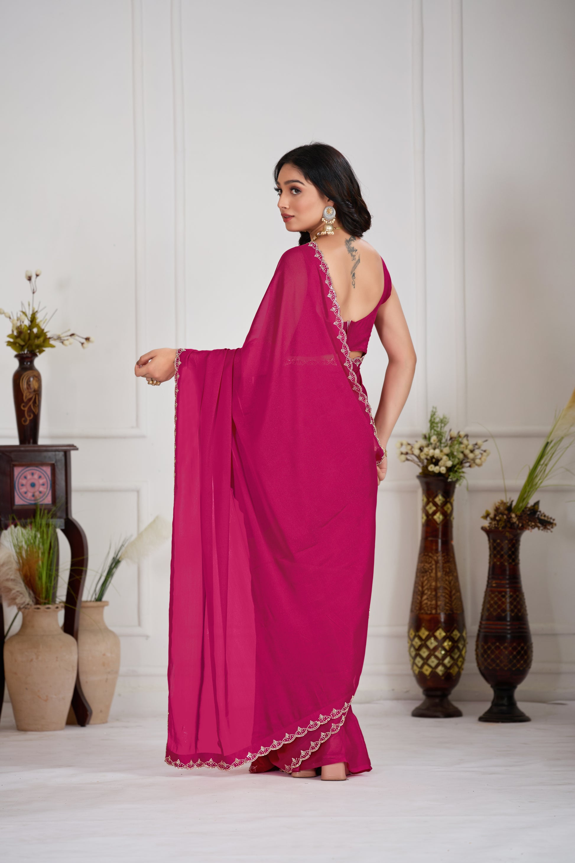 Make every occasion special with this stunning rani colour saree designed for modern festive elegance. The saree features a rich georgette fabric with a soft flowing drape that feels comfortable and luxurious. A beautifully detailed jarkan border enhances its glamour, while the matching embellished blouse adds sophistication and completes the premium look.