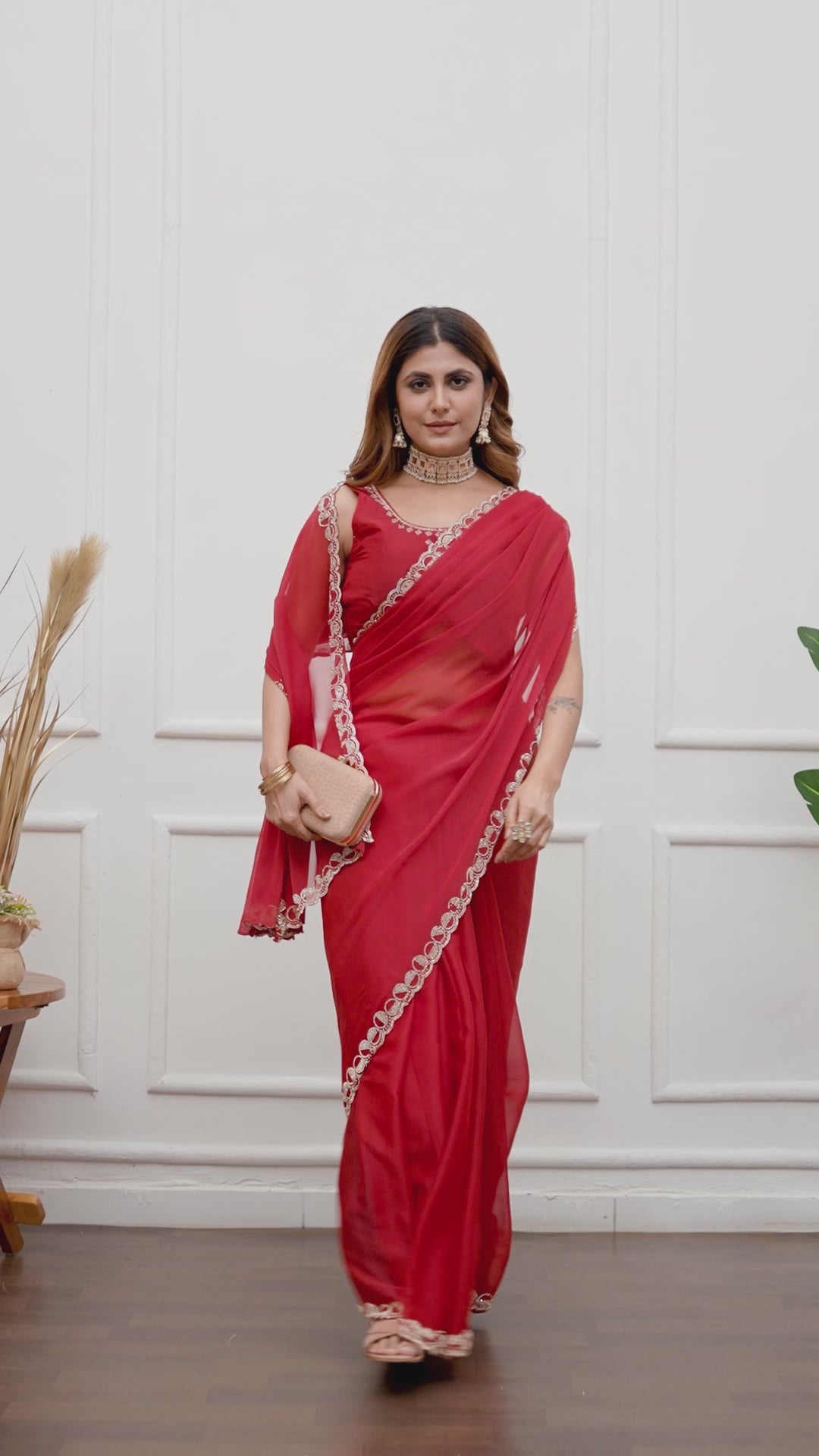 Experience timeless elegance with this meticulously crafted red georgette saree, designed for the discerning wearer who values both aesthetics and comfort. The breathable georgette fabric provides superior drape and movement, allowing you to wear with confidence through extended celebrations without compromising on ease. Jarkan embellishments are strategically placed to create visual interest and luminosity, reflecting light with every gesture. The rich crimson shade offers remarkable versatility, harmonizing beautifully with diverse skin tones and complementing an array of jewelry selections. Whether gracing a wedding ceremony or attending a prestigious festive gathering, this saree delivers authentic ethnic charm paired with contemporary practicality, making it an investment piece for your special occasions.