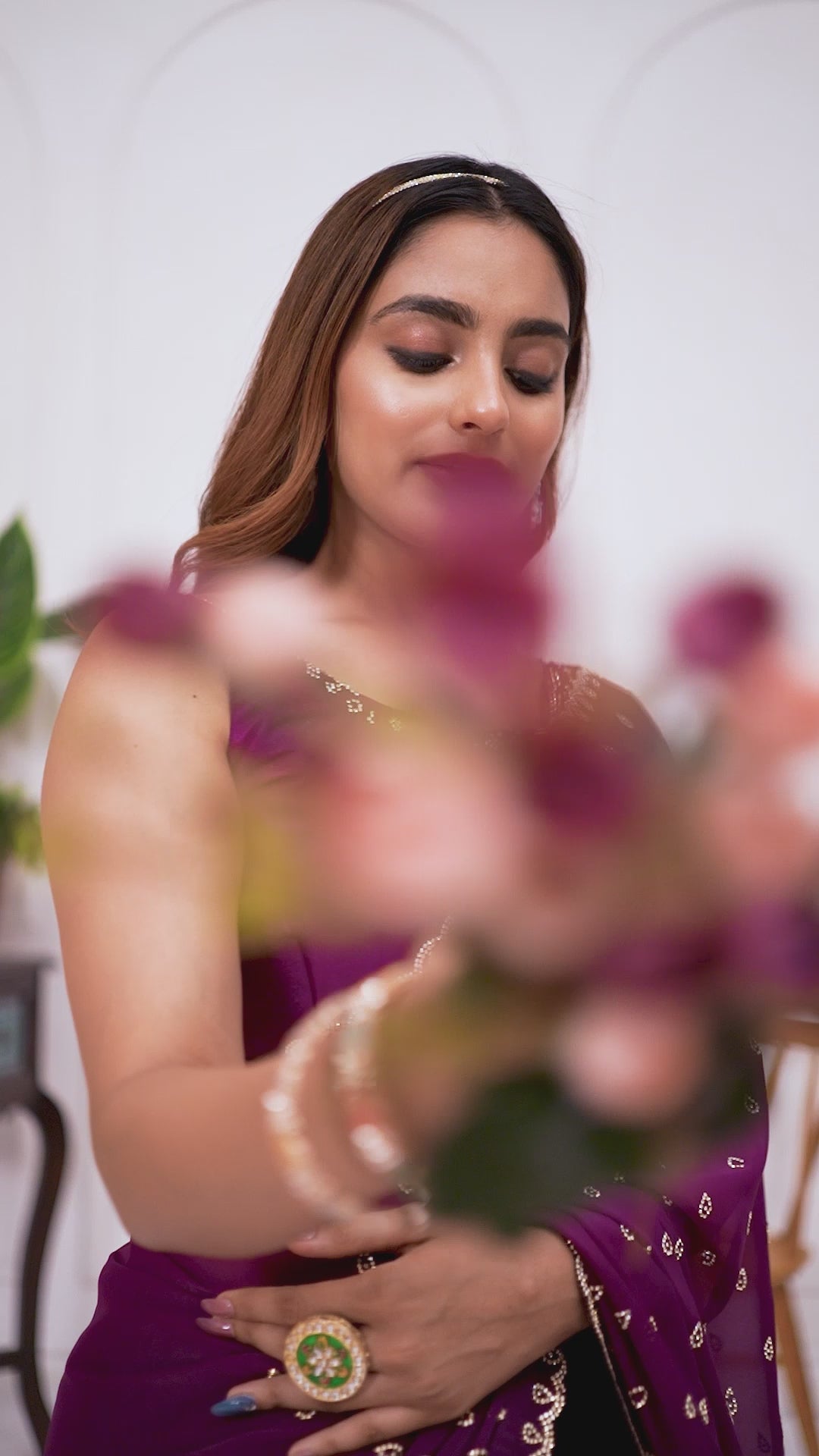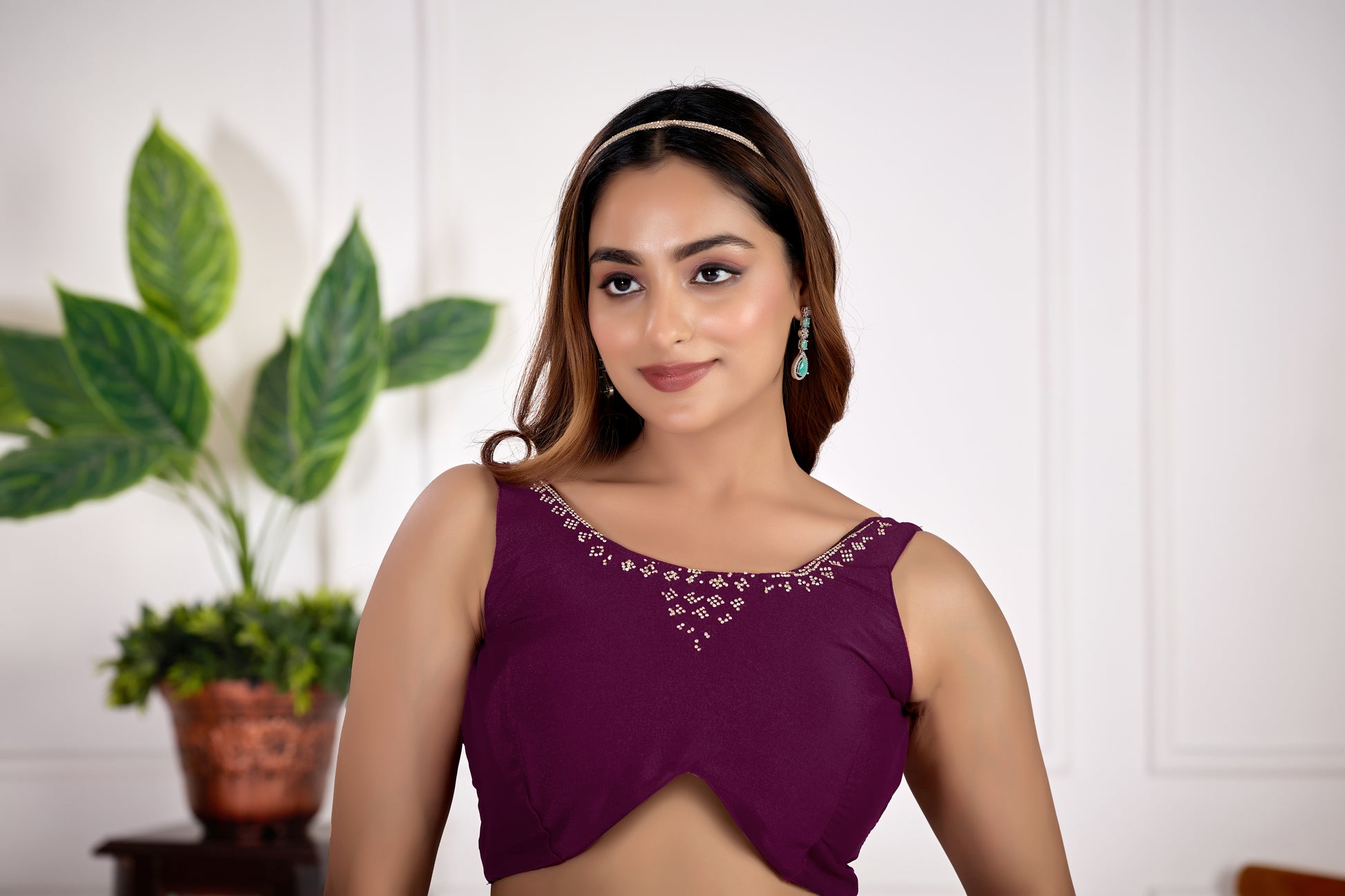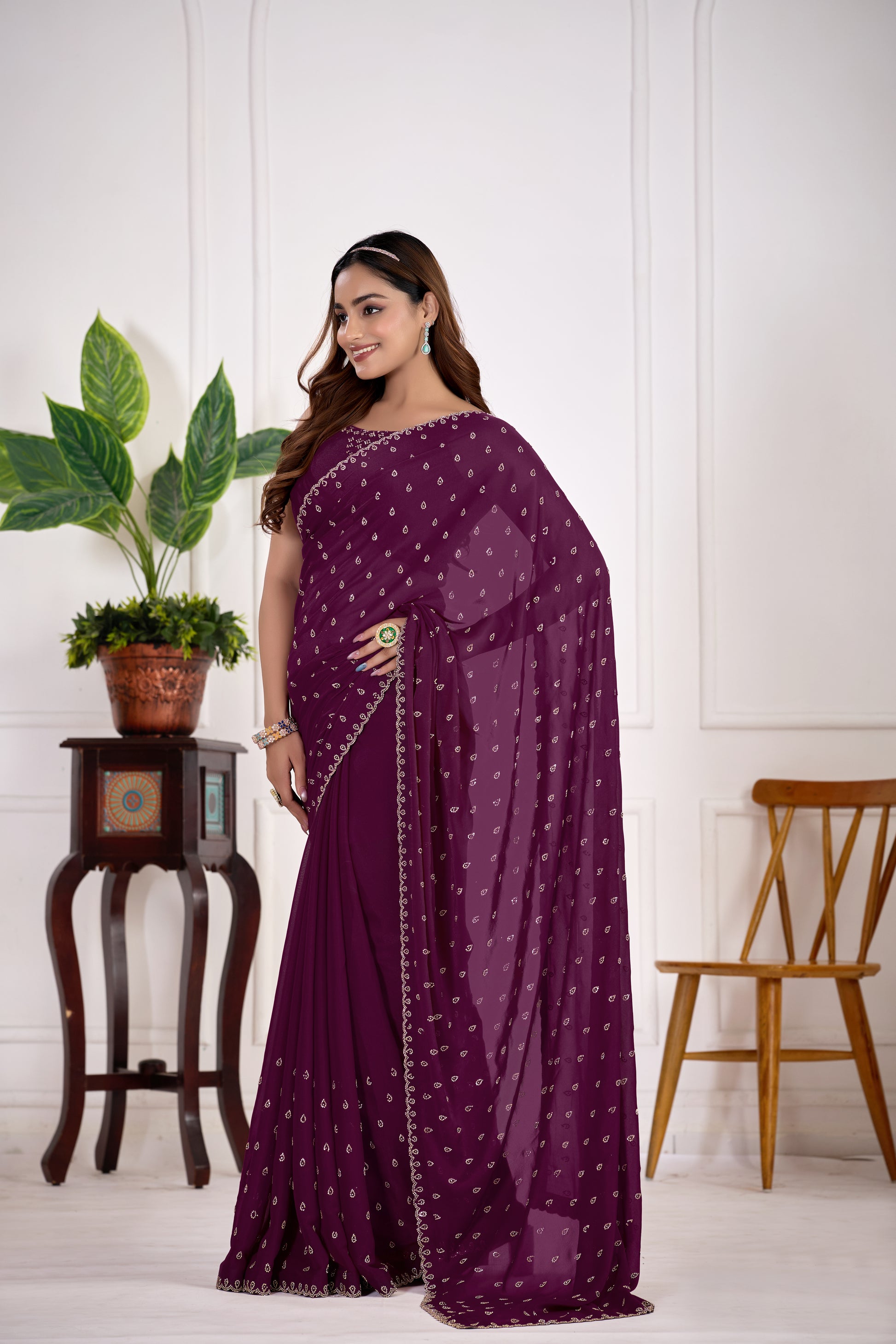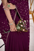 Discover timeless elegance with this premium satin silk saree rendered in a sophisticated wine tone. The garment showcases comprehensive Jarkan butty Work —a traditional technique that adorns the entire surface with intricate metallic threadwork. Crafted from high-quality satin silk, it delivers a graceful drape and refined sheen ideal for weddings, festivals, and formal gatherings. The deep wine shade pairs seamlessly with gold and silver jewelry, while the elaborate embroidery demonstrates superior artisanal skill. An investment piece for discerning wearers who value authentic craftsmanship and enduring style.